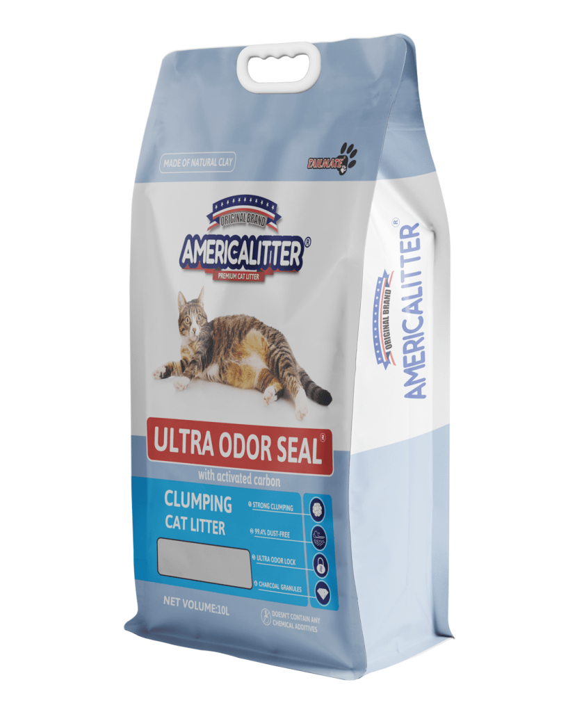 America Litter Ultra Odor Seal es una arena para gatos con un gran poder absorbente y aglomerante. Su fórmula especial de bentonita y carbón activado sella completamente los malos olores y reduce considerablemente el polvo. Es 100% natural y libre de agentes tóxicos